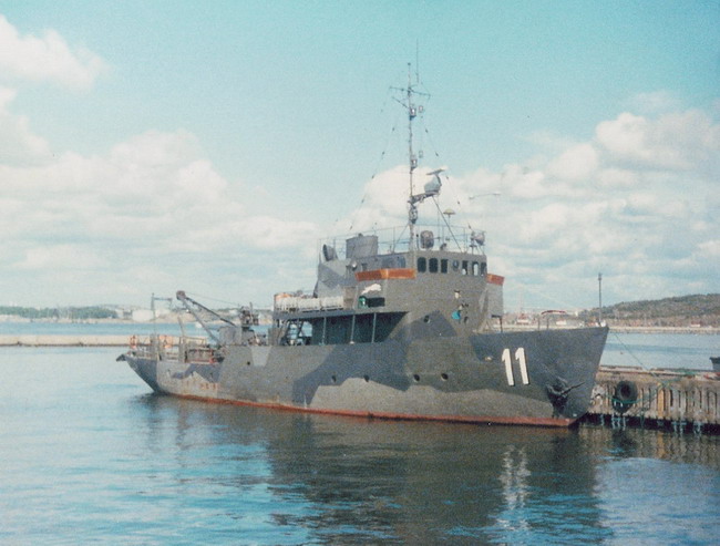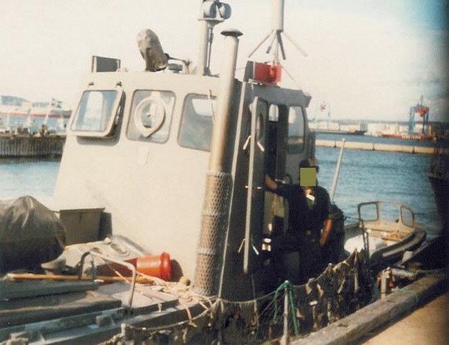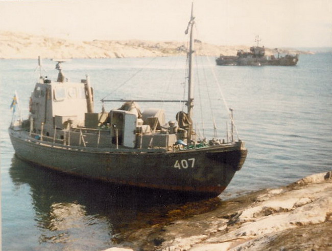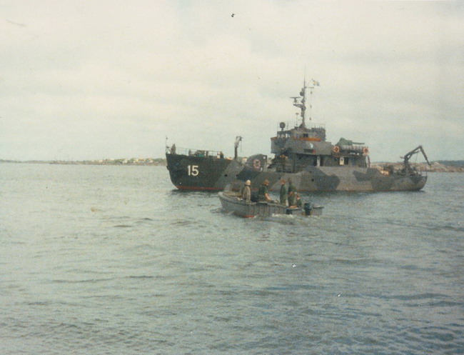 [Bild 19] TPK 407 som bland annat användes som bas för röjdykarna som ingick i Muldiv. På fördäck mellan masten och hytten hade vi då en tryckkammare och övrig utrustning för detta. Även på den här låg jag ett tag. Bakom den skymtar Mul-15.