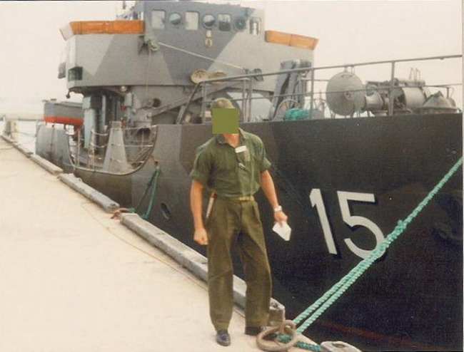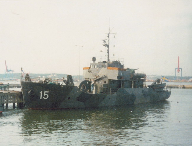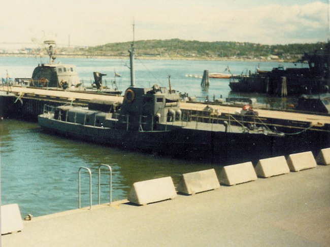[Bild 22] Mul-15 med ett av befälen bredvid på kajen. När det gäller kanoner så fanns följande ombord: Mul-11 - 20mm Allmålspjäs m/40-73 Mul-15 - 40mm Fältmålspjäs m/36 BevB64 - 20mm Allmålspjäs m/40-73 BevB69 - 20mm Allmålspjäs m/40-73 |