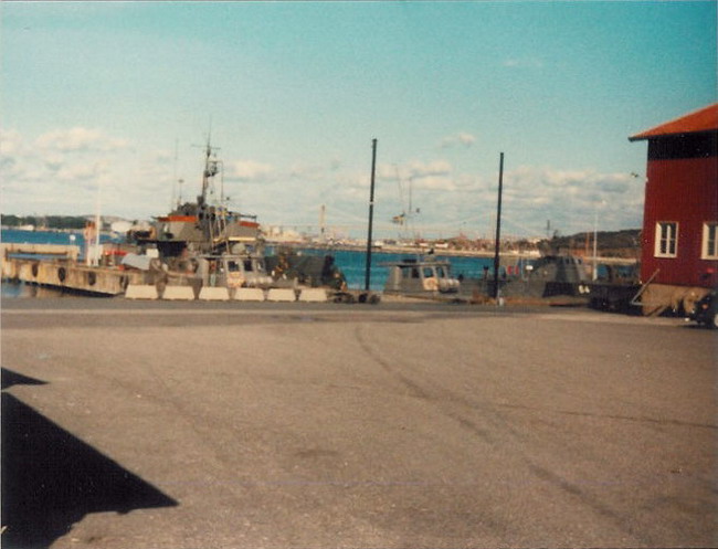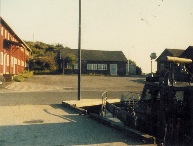 [Bild 6] Hamnplanen, husen till höger och vänster har jag för mig var förråd och huset rakt fram vill jag minnas var det där Sjötransporten höll till. KA4:as båtar var delade mellan Muldiv och Sjötransporten, där sjötransporten skötte trupptransporter och andra transporter, medan Muldiv höll på med mineringar. Sjötransporten hade de flesta 200-båtarna plus färjan Loke och ett par andra, medan Muldiv hade Minutläggarna och resten av de båtar som visas här. Bland annat så skötte Sjötransporten alla transporter av materiel till förbanden och batterierna ute på öarna. Inom Muldiv/KA4 höll vi mycket på med utläggning och underhåll av mineringar från Göteborgs södra skärgård och upp till Strömstad. Nedåt Halland var vi inte något nämnvärt, även om detta så att säga även ingick i området och mineringar fanns även här. Halland söder om Varberg saknar dock helt skärgård, så där är det bara mineringar precis i inloppen till hamnarna som funnits och i övrigt inga (KA-)batterier, utan bara värnkanoner. Om dessa värnkanoner egentligen hörde till KA eller Artilleriet inom Armén, vet jag faktiskt inte.
