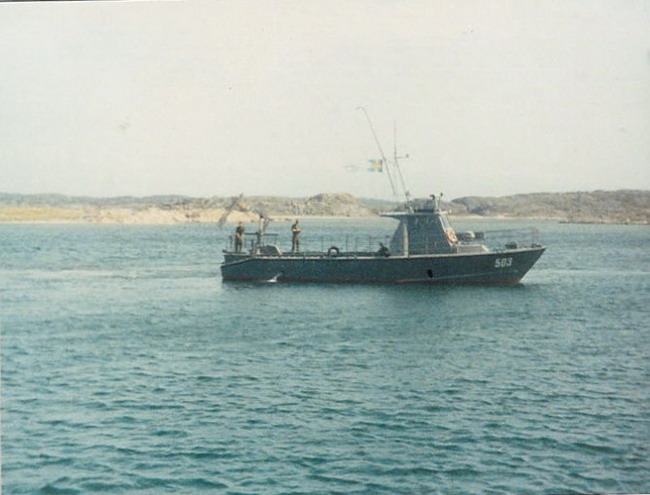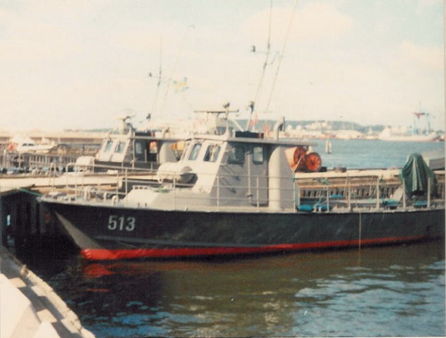 [Bild 17] MAbS 513, det vill säga Minarbetsbåt Större nr 513. LÖA=16.0m, B=4.3m, D=0.8m, Deplacement=19 ton, Fart=16 knop. Bakom den ligger MAbS 503 som i allt viktigt har precis samma specifikationer.