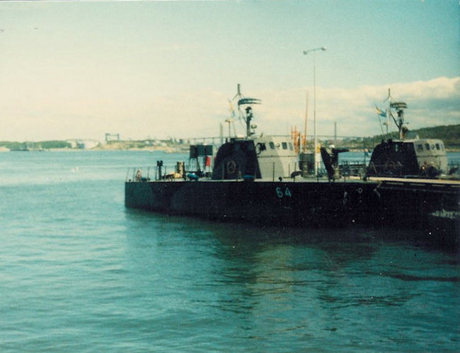 Bevakningsbåt 64, som jag låg på ett tag, en fin båt som gick rätt bra. LÖA=21.1m, B=4.6m, D=1.3m, Deplacement=28 ton, Fart=17 knop. Bakom 64:an ligger Bevakningsbåt 69, som i det mesta har samma mått och utrusning som 64:an, maskineri och lite annat skiljer dock, plus att 69:an var en knop snabbare... :)