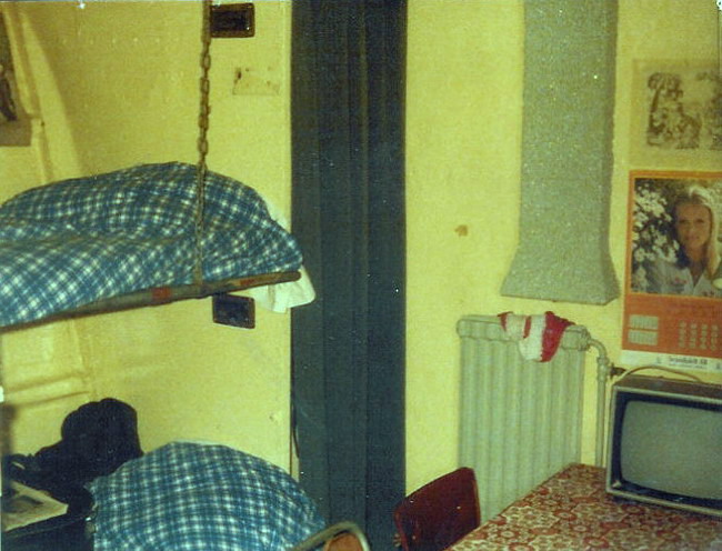 [Bild 1] Muldivs kasern ("G" dvs. Kasern Gustav), där vi låg de första månaderna tills vi mönstrade på båtarna. Visst längtade vi efter att få mönstra på båtarna och komma ut ordentligt, men det var en rätt sträng och bister vinter så på det sättet var det nog skönast att ligga på kasern. Vi var ju ute en del med båtarna ändå och det finns inte mycket som kan bli så totalt nedisat och svinkallt som ett örlogsfartyg när det är minus tio och blåser kuling... Här i kasernen låg jag själv i luckan längst till vänster på första våningen ihop med sju andra snälla soldater på divisionen.
